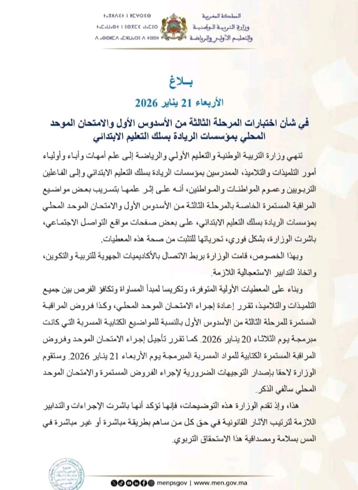 كما قررت كذلك، وفق البلاغ ذاته، تأجيل إجراء الامتحان الموحد وفروض المراقبة المستمرة الكتابية للمواد المسربة المبرمجة يوم الأربعاء 21 يناير 2026.